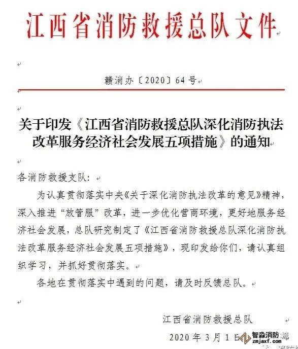 3、江西省消防救援總隊作為應急管理部消防救援局確定的消防救援隊伍正規化建設試點單位,側重于執法規范化建設試點。同時,為全面落實省委省政府“確保疫情防控有力有效、經濟恢復有序有力”的部署要求,更好地支持企業復工復產服務經濟社會發展,決定試點推行告知承諾管理。